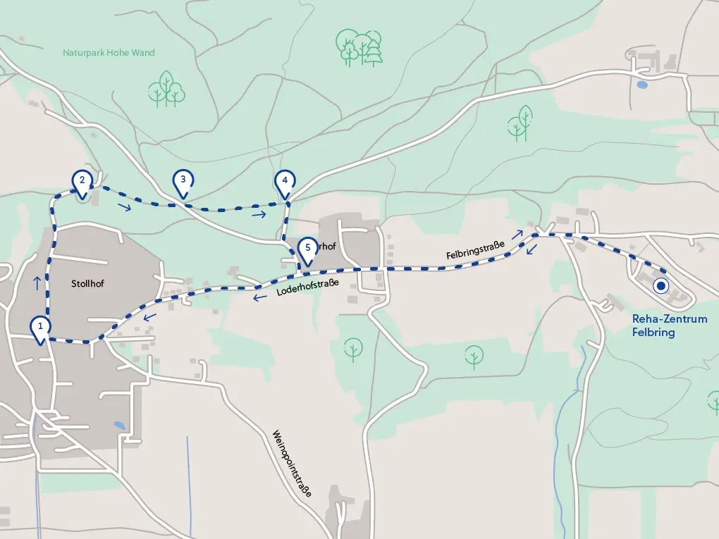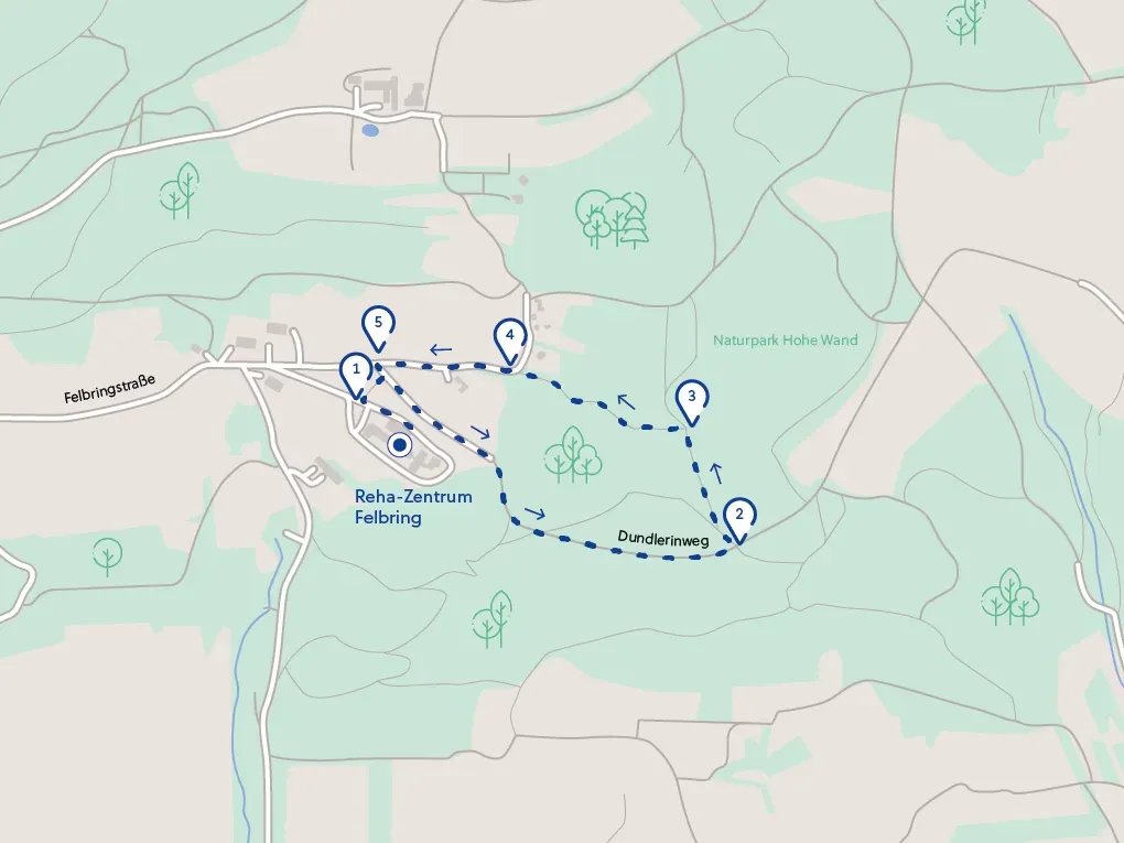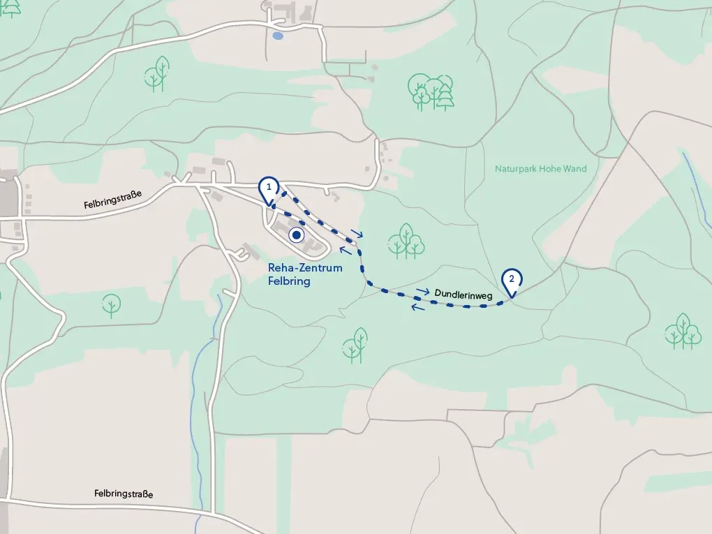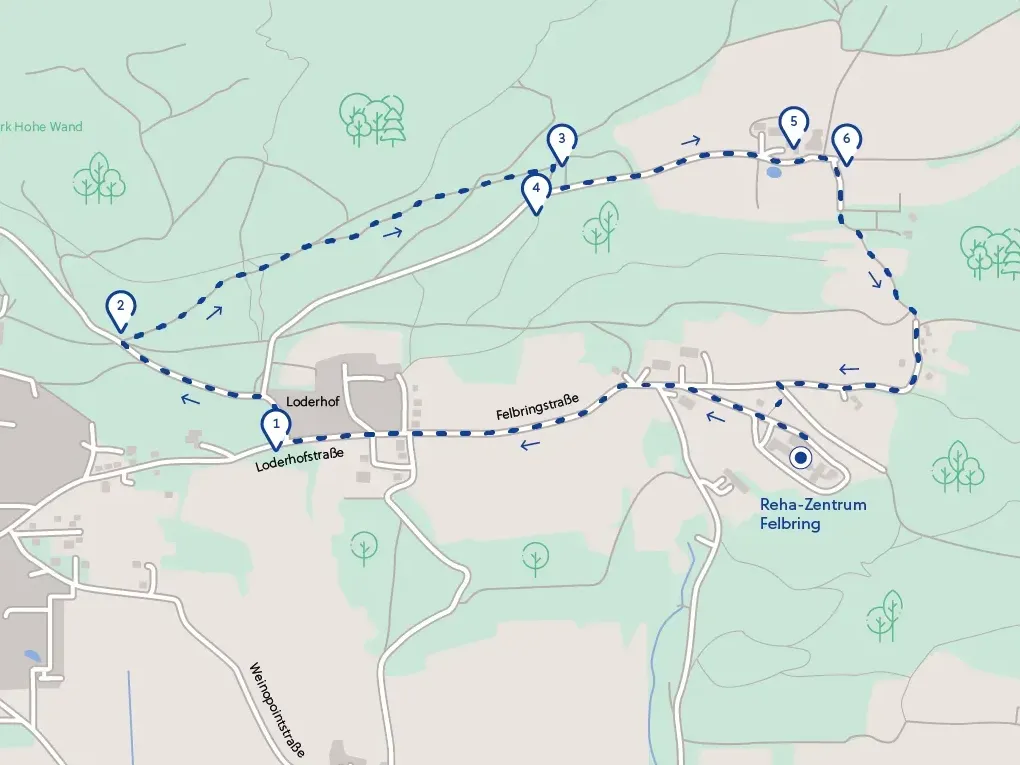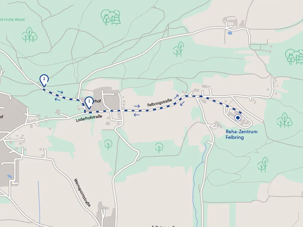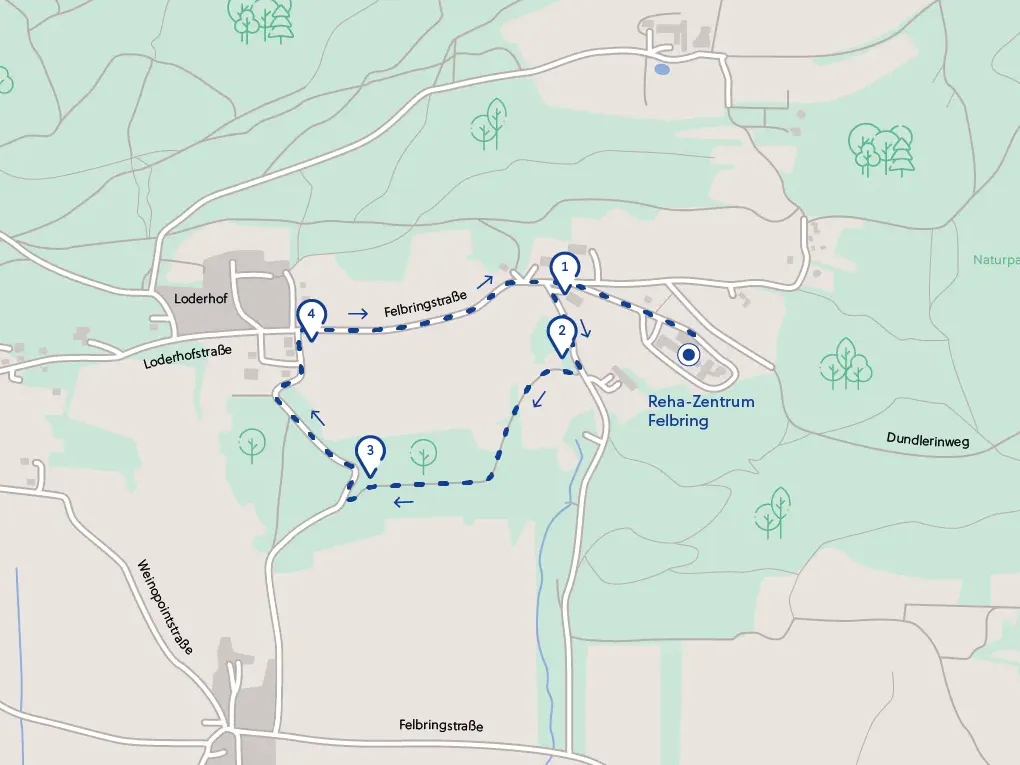 Vom Reha-Zentrum der Felbringstraße folgen, bei den Wohnhäusern (1) links bergab gehen, (2) beim Wegweiser Alter Heilstätten Weg rechts abbiegen, weiter bis zum Beginn einer Asphaltstraße, (3) wieder rechts abbiegen und bergauf (Achtung: steiler Anstieg, ca. 35 hm) bis zur Kreuzung, (4) danach geht es rechts wieder zurück zum Reha-Zentrum.Download GPX-Datei (10 KB)