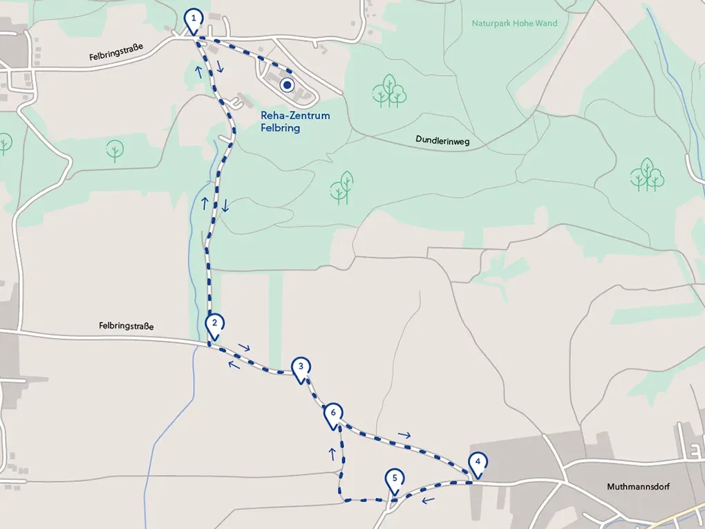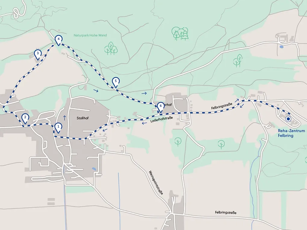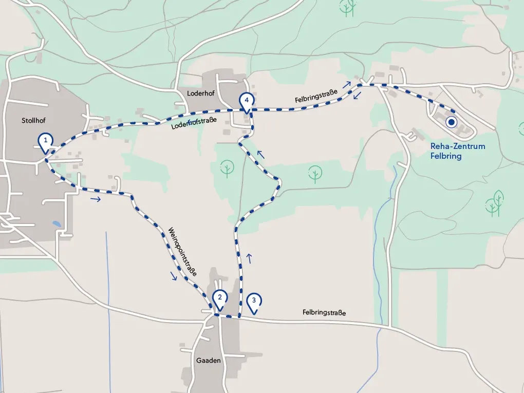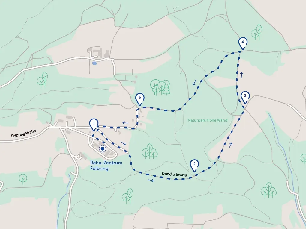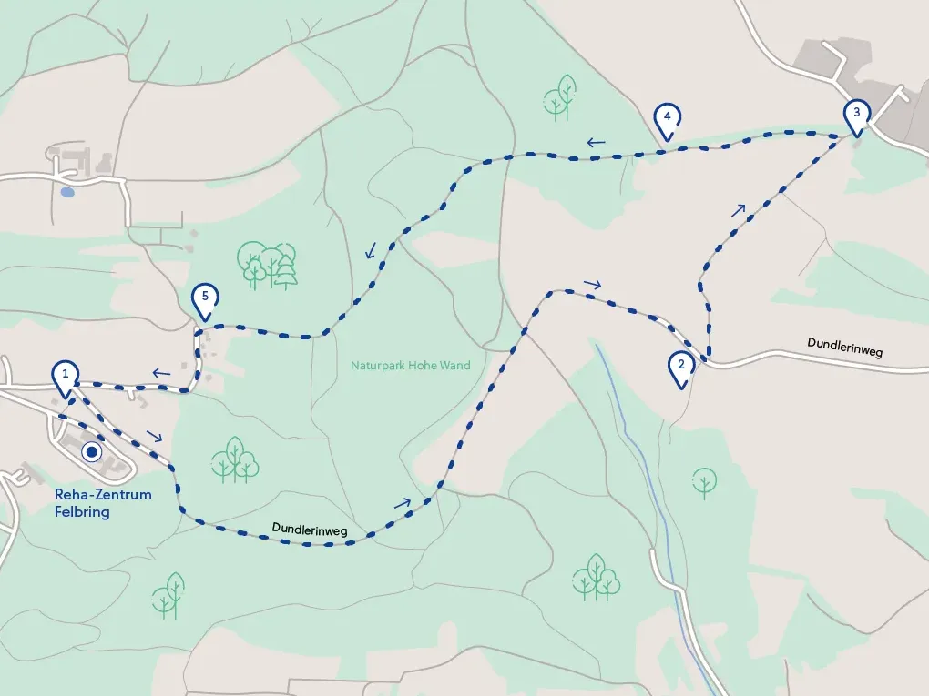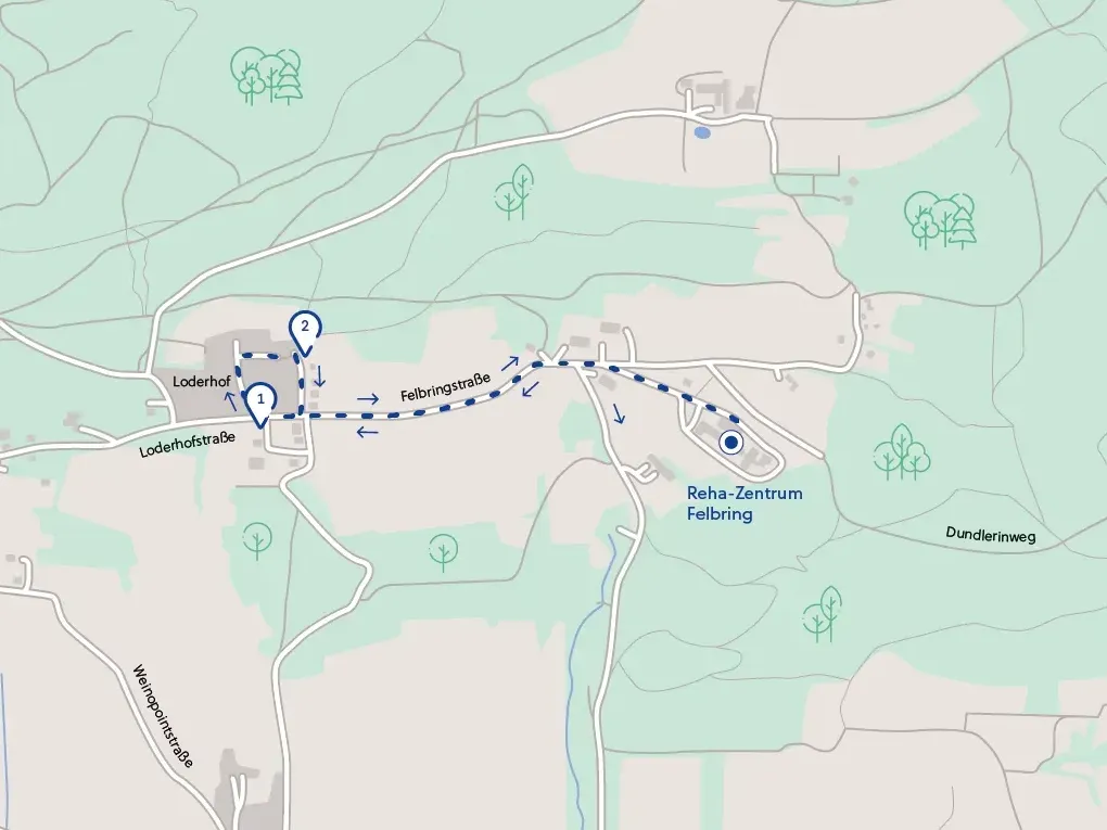 Vom Reha-Zentrum der Felbringstraße folgen, bei den Wohnhäusern (1) links bergab gehen, (2) beim Wegweiser Alter Heilstätten Weg rechts abbiegen, weiter bis zum Beginn einer Asphaltstraße, (3) wieder rechts abbiegen und bergauf (Achtung: steiler Anstieg, ca. 35 hm) bis zur Kreuzung, (4) danach geht es rechts wieder zurück zum Reha-Zentrum.Download GPX-Datei (10 KB)